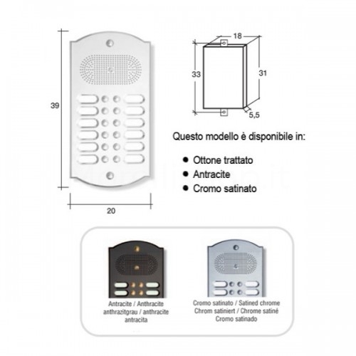 DOTAZIONE: Pulsanti in ottone e scatola da incasso zincata, cartellino portanome in plastica bianco latte per permettere la retroilluminazione, è disponibile, se desiderato, il servizio di incisione del cartellino cliccando QUI.